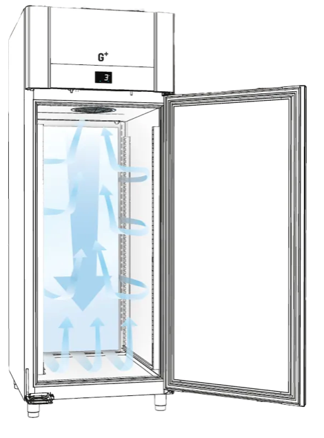 Uniek luchtverdeelsysteemAlle G+ producten zijn voorzien van een krachtig, geventileerd koelsysteem, wat zorgt voor een goede temperatuurstabiliteit en luchtverdeling. Dankzij ons uitstekende luchtverdeelsysteem worden de temperaturen in de hele kast altijd gelijkmatig en consistent gehouden, waardoor uw producten optimaal bewaard worden. Hierdoor wordt effectief voorkomen dat de bakkerijproducten uitdrogen. |